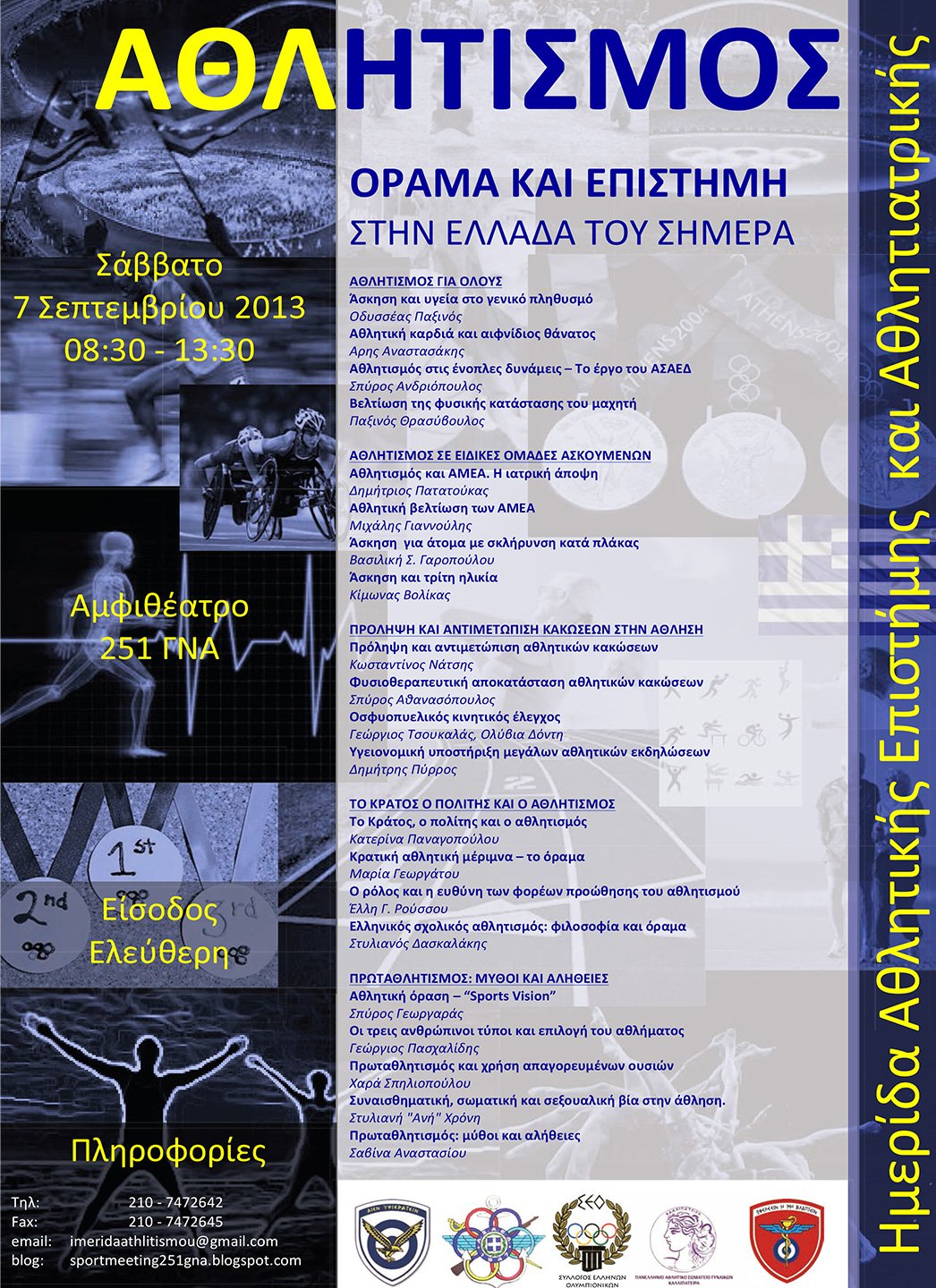 Το Σάββατο 7 Σεπτεμβρίου 2013, θα πραγματοποιηθεί στο αμφιθέατρο του 251 Γενικού Νοσοκομείου Αεροπορίας (251ΓΝΑ), Ημερίδα Αθλητικής Επιστήμης και Αθλητιατρικής , η θεματολογία της οποίας είναι προσανατολισμένη σε ένα γενικό ακροατήριο πολιτών που ασχολούνται με τον αθλητισμό όπως αθλούμενοι πολίτες, στελέχη των Ενόπλων Δυνάμεων, προπονητές και αθλητές συλλόγων, Καθηγητές Φυσικής Αγωγής καθώς και υγειονομικό προσωπικό.